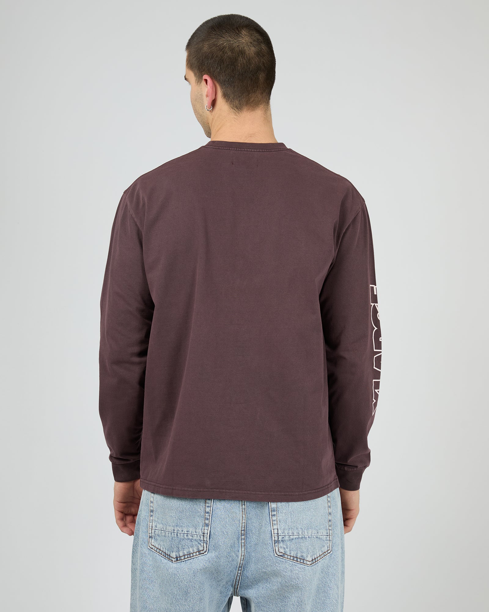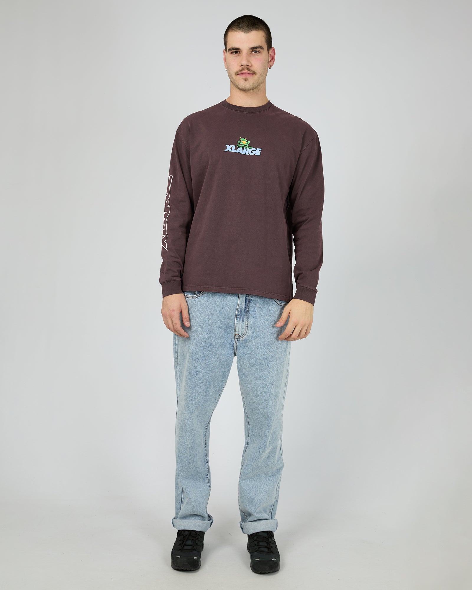 The Xlarge Frog Long Sleeve Crewneck Tee in Chocolate Plum is a custom box-fit, constructed from a combed cotton jersey.