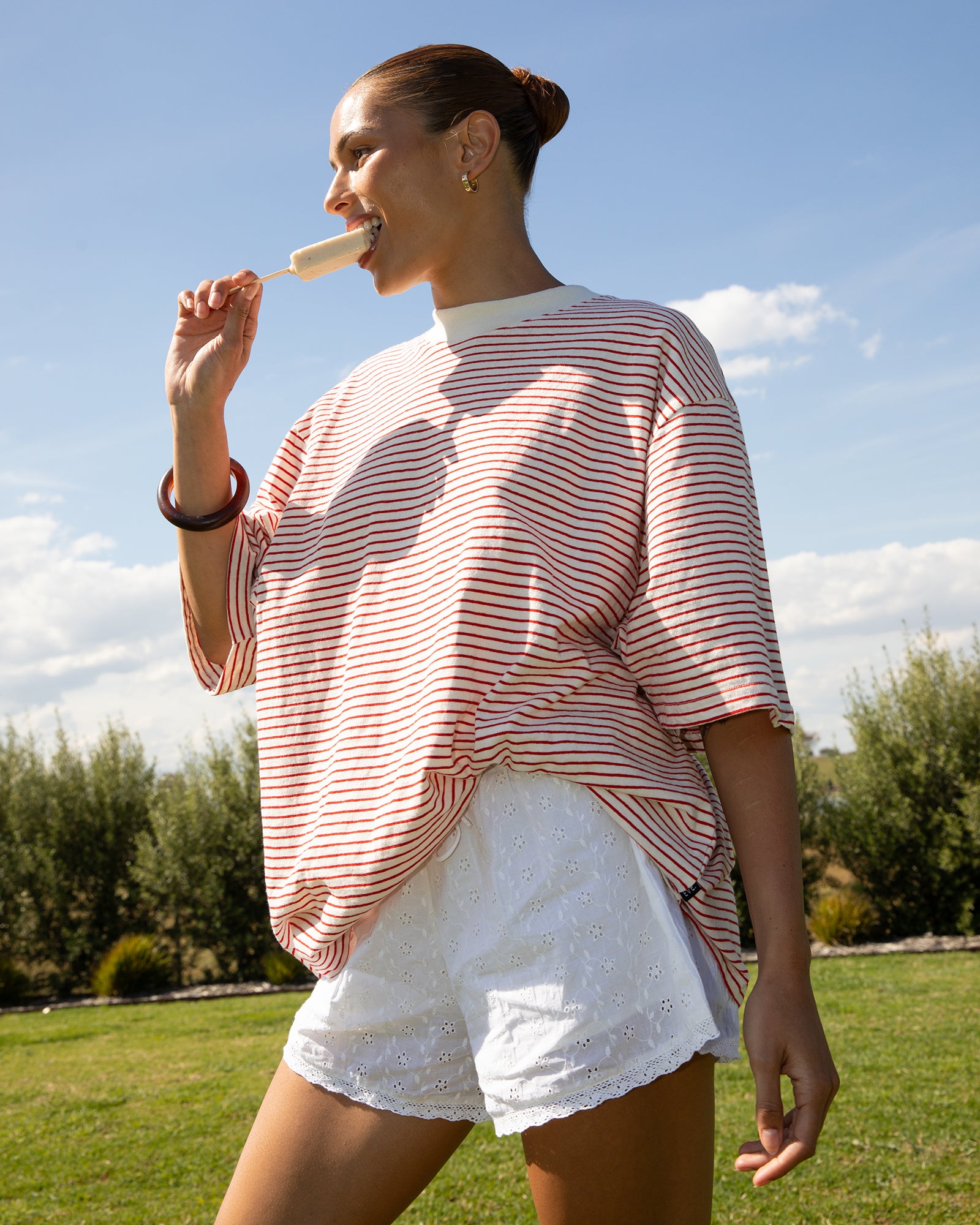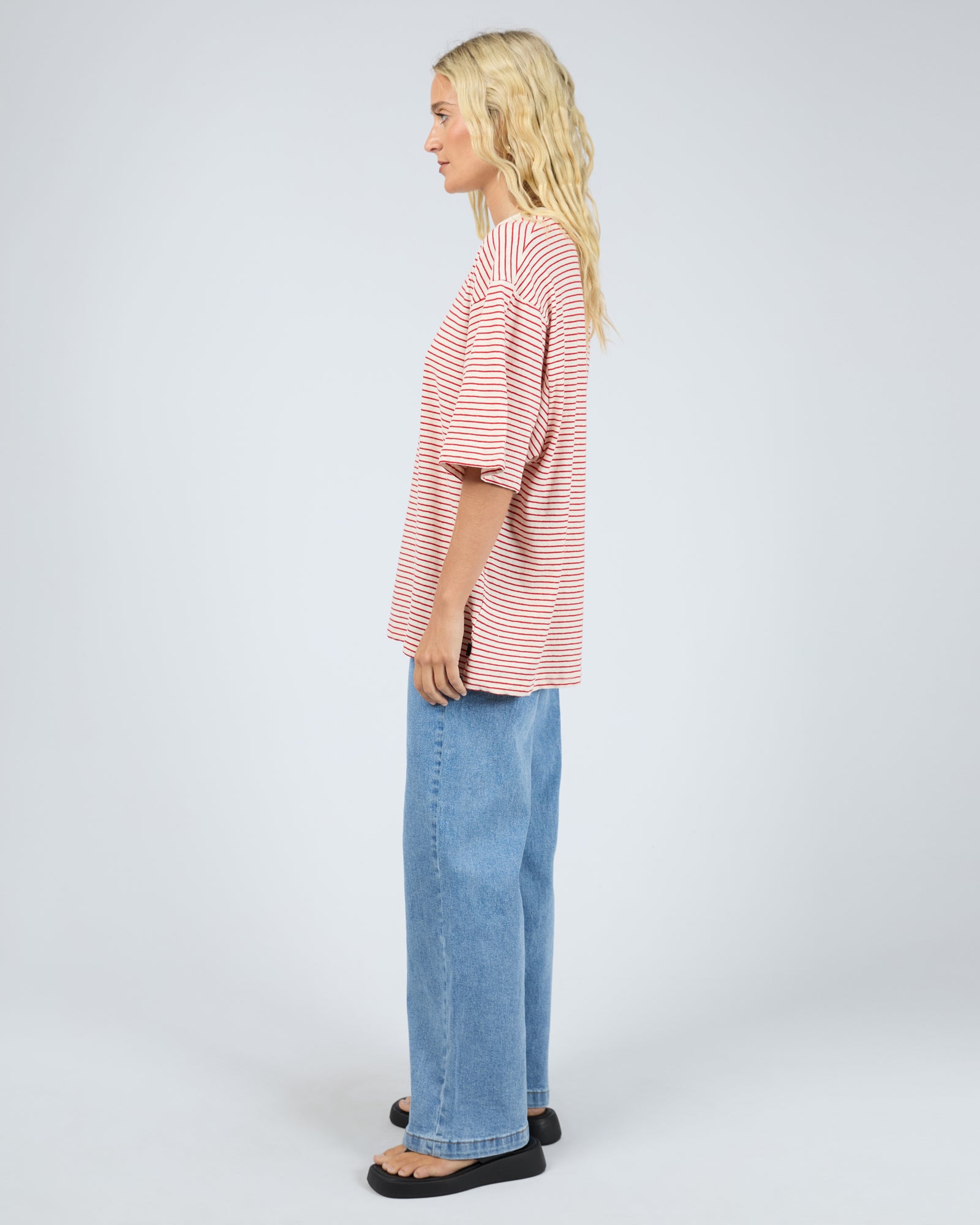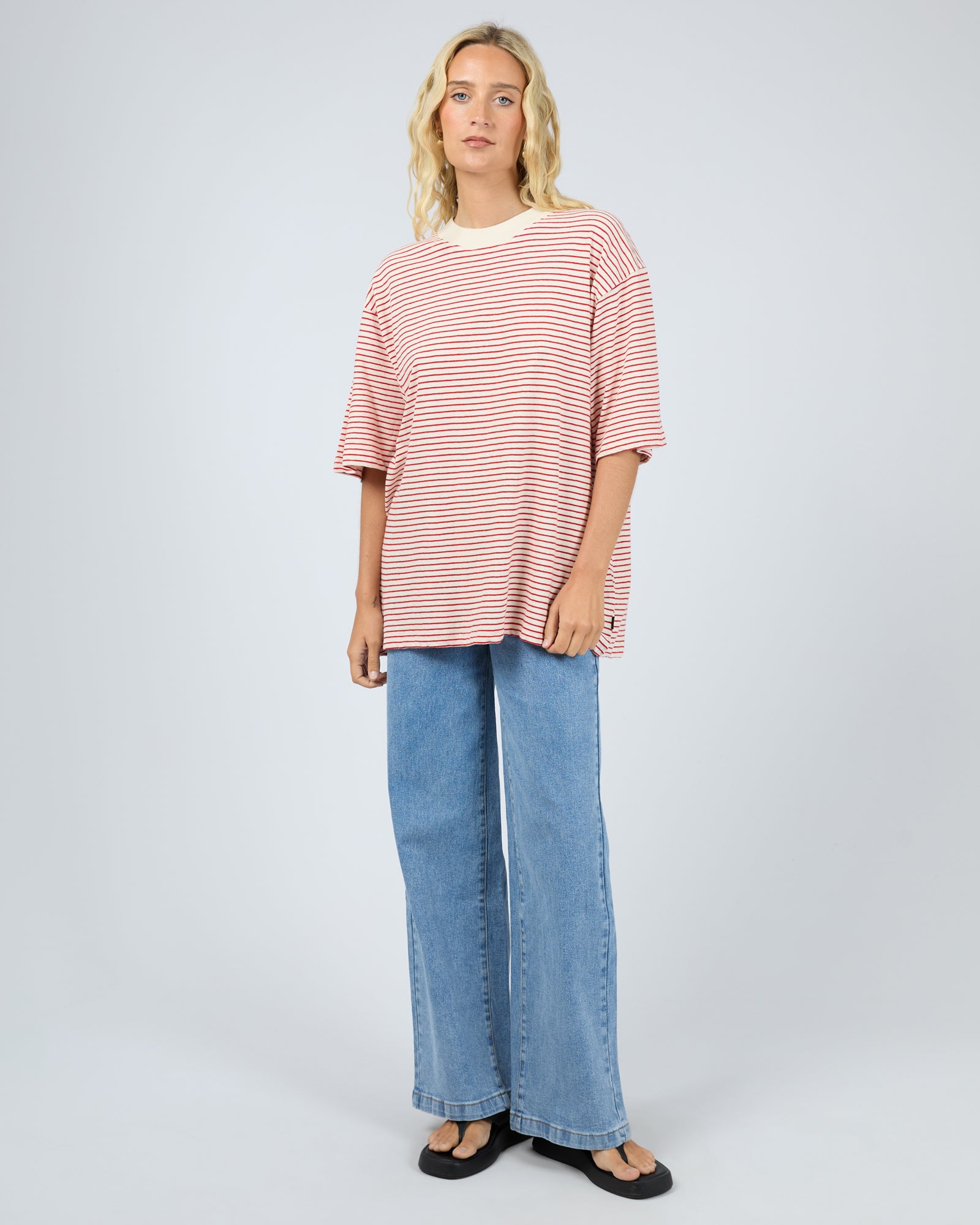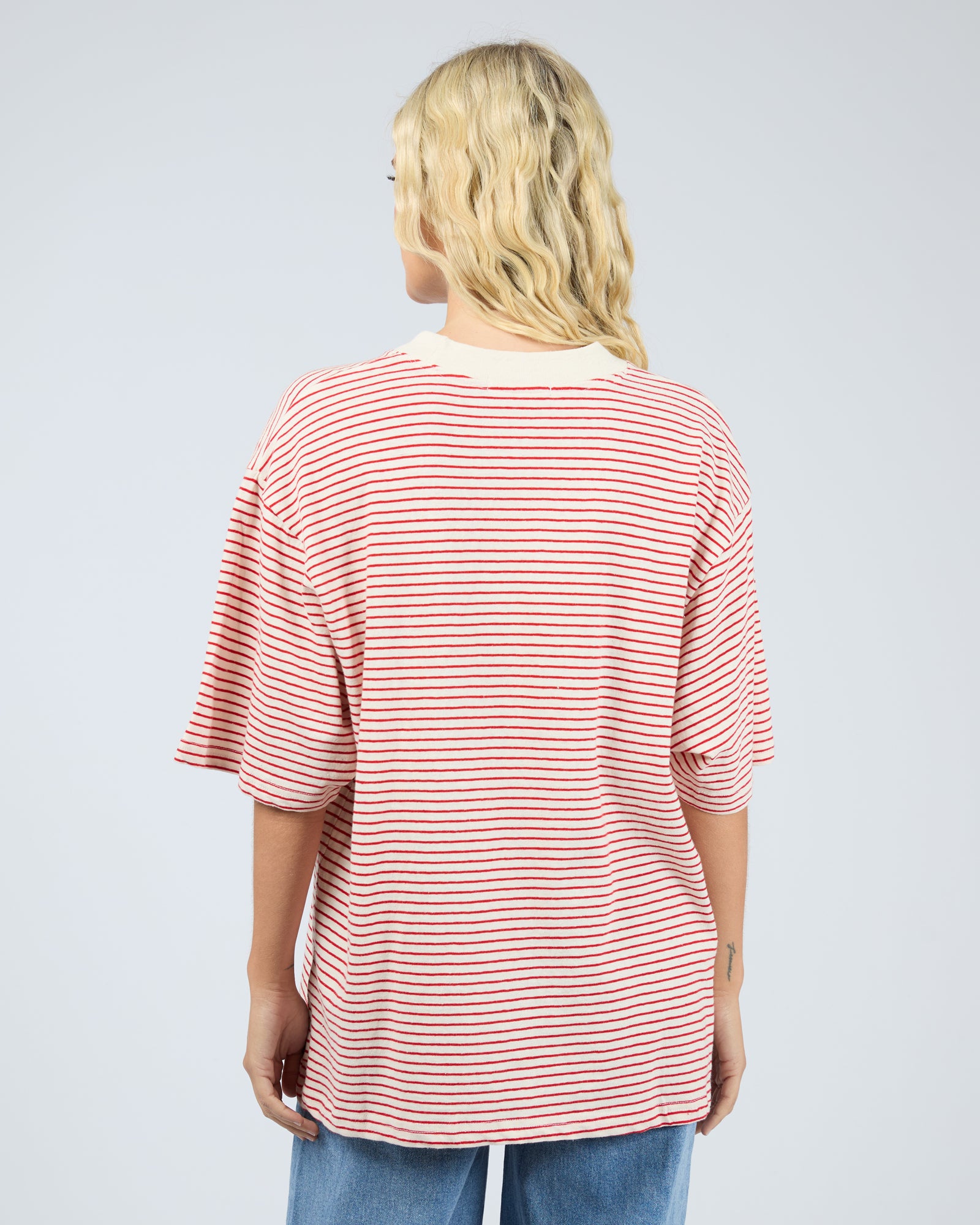 The Kya Oversized Stripe Tee brings effortless cool with a coastal-inspired stripe design in bold red and white. Crafted from a soft cotton and hemp jersey blend, it offers a naturally breathable feel with subtle texture and drape. The oversized silhouette delivers relaxed, everyday comfort, elevated by a ribbed crew neckline and wide sleeves. Perfect for laid-back summer days, style it with denim shorts, linen pants, or over swimwear for an easy put together look.