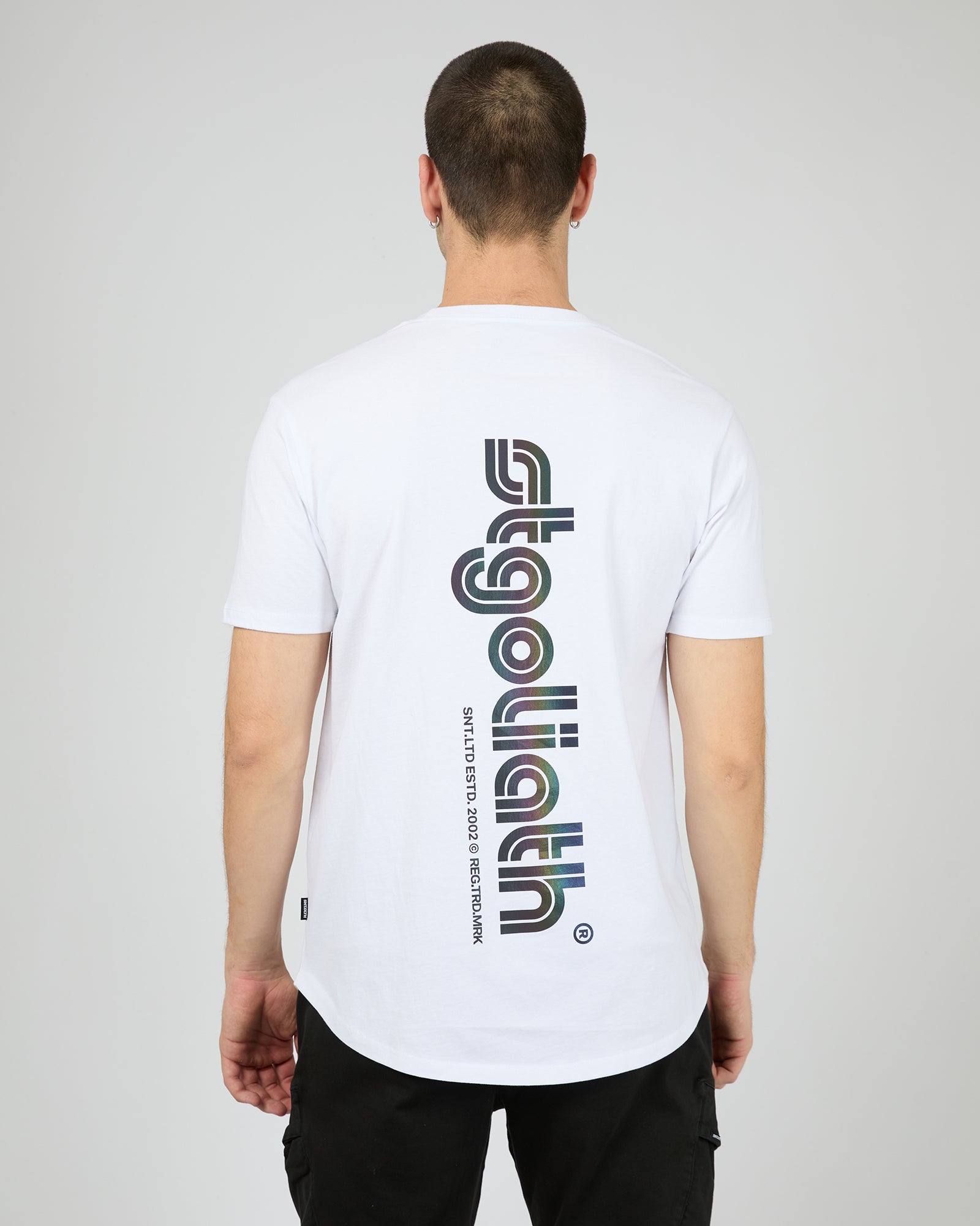 The Rolla Iridescent Tee in White features distinctive Chest St Goliath branding and a striking spinal print, adding unique style to your casual wardrobe. Designed with a relaxed fit, it offers comfortable wear for everyday activities. This tee combines bold design with easygoing comfort, making it a versatile choice for your laid-back looks.